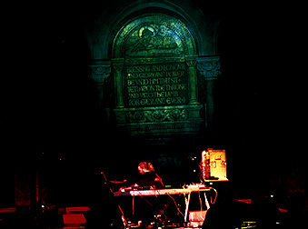 ...I'm afraid that I'm still glowing with awe, having heard Ian's performance at the Gathering. Ian worked wonders with a road case of Doepfer A-100 and Analogue Solutions Cuncussor modules synchronized to a MIDI rig for pads, melodies, textures, percussion, and plenty of samples of modular madness atmospherics panning wildly to and fro. (That was some of my favourite bits!) A long set, a shorter set, and an encore consisting of a great live rendition of a stonking sequencer piece, "Frozen Web" from his "Box of Secrets" CD (DiN 1). (Did the Cathedral REALLY cool down during that piece?) Jeff Towne outdid himself with the set up and operation of the largest lighting system I've seen him use to date. (And I've seen most of