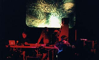 by CindyLyn Review: The Gathering with Jeff Pearce, Mike Griffin + Dave Fulton On a somewhat chilly October evening, an audience of about 100 people were treated to another concert event in the realm of Ambient music. The stone and wood building of St. Mary's sanctuary was again filled with the resonance of sound layering and the reverberant rhythm of sequential patterns. The featured artists were: Mike Griffin and Dave Fulton, who played the first set of music, and later guitarist, Jeff Pearce. Griffin and Fulton, their new release " Imprint" were outfitted differently than what I had become accustomed to seeing in an Ambient presentation. Instead of a collection of keyboards from Yamaha, Roland, Nord, EMS, Korg, etc.. their set-up was almost without a keyboard (ok, they did have an old Oberheim, but it was a loaner from Chuck V. and served as a trigger for Dave's rack). This pair was perhaps a view into the future of electronic music. Mike Griffin sat statuesquely behind a small laptop MAC, with another "black box" of electronics before him, and of course a mouse. Dave Fulton had a rack mounted system in a wooden cabinet that stood almost 7 feet tall. Atop the rack was a sequencer and below rack, modular synthesizers with filters and effects. The modular units were joined by a series of patch cords. (...the days of Moog long gone..) The performance of the two artists was unique in their "body motion". Mike was close to motionless (although he did later seem to rock a bit in motion to the music) other than his hands, whereas Dave was in a constant state of tuning "pots" triggering keys, adjusting filters and introducing sounds. Occassionally they would speak a word or two between them, but were otherwise fully involved in performing their "creation " of music. Their set lasted about 40-45 minutes, but I lost track of time and honestly could care less about time while I'm listening. An ever- changing video display of 3-D graphic designs played behind them, but I found myself switching between watching the screen and just closing my eyes, since I feel electronic music is best viewed in complete darkness, which allows your mind to "wander" within the composition. After a brief intermission, Jeff Pearce, without shoes (white socks), sat down with a few guitars and a Chapman stick. He also was a contrast in concert, since he began by actually speaking to the audience. He spoke about his new release "Bleed" and would first play some short pieces from it and then proceed to more "ambient" style selections. His gear included fender stratocasters, an E-Bow and playing with a common butter knife across the neck of his guitar. The audience would applaud after each piece, which were short in comparision to the normal electronic compositions... (Chuck can't run out for a pizza on these type pieces at 2:30 am - course, who the hell's open then anyway?) I really enjoyed one piece "Beyond and Within" and spoke to Jeff after the show to find out what cd it appeared on. "To the shores of Heaven"... then went and promptly bought it (I bought "'as well, since it's not easy to find these artists without some searching first). The concert ended with a combined effort by all three artists playing together. (I really think Jimi Hendrix would have been proud seeing the usuage of new instruments and applications on guitar.) The evening's show provided a surrounding to take the "chill" out of the October air and replace it with soothing echoes and calming tones. Wow and to think I gave up watching tv at home for this...