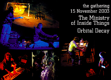 by soma611 Review: MoIT + Orbital Decay at The Gatherings - Nov 15 "The Gatherings is perhaps Philadelphia's premier electronic music concert venue. Last night, November 15, 2003 two local groups, Orbital Decay and The Ministry of Inside Things shared the bill. It was another fine evening of live electronic music for which Philadelphia is globally known. ..." read more (off-site)